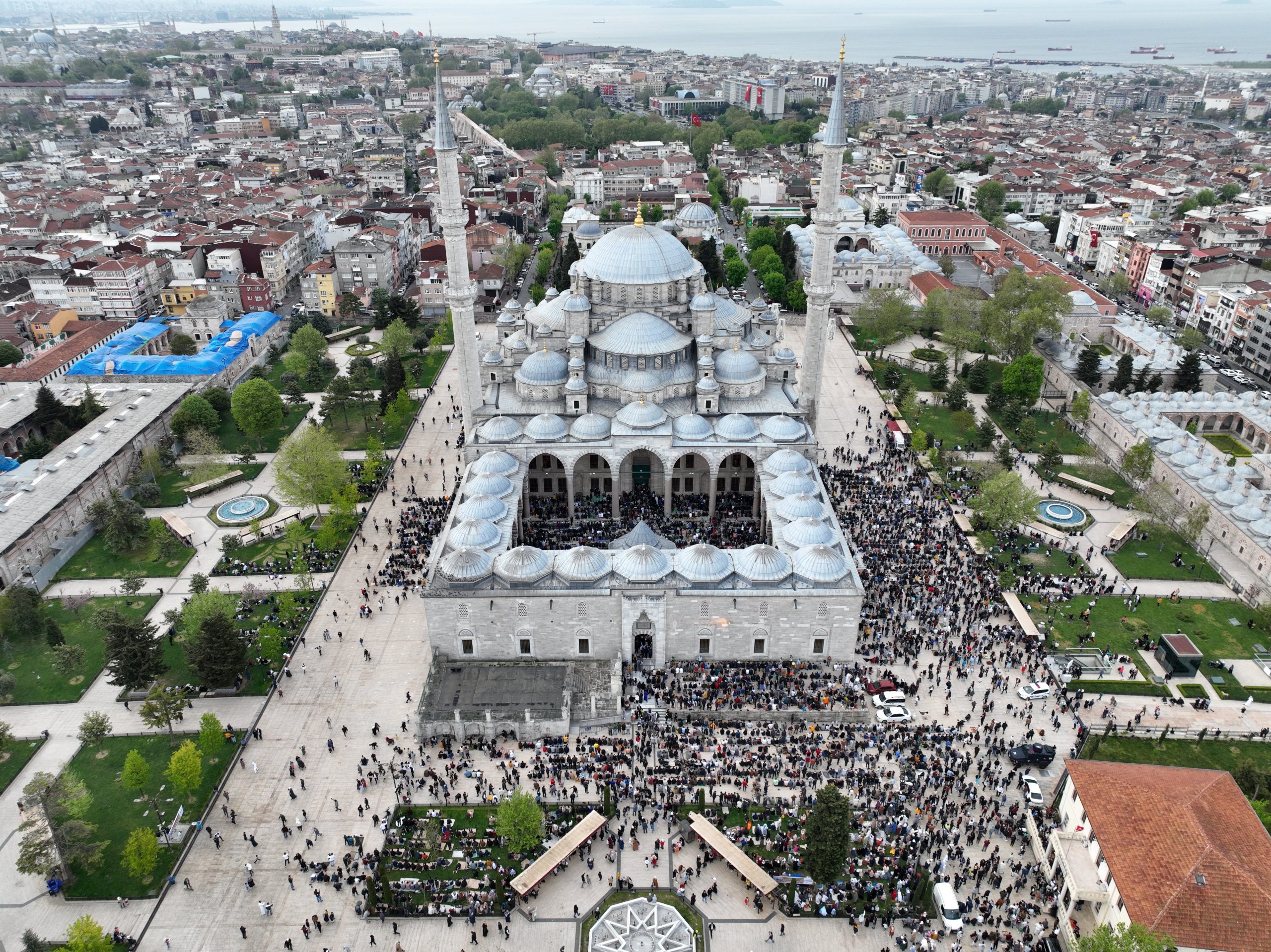 Ramazan Bayramı’nda vatandaşlar Fatih Camii’ne akın etti. Caminin içine sığmayan vatandaşların avluyu doldurması, havadan çekilen görüntülere yansıdı.