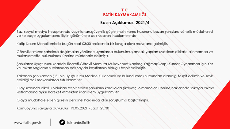 Fatih Kaymakamlığı’ndan o görüntülerle ilgili açıklama geldi. Açıklamada, “Bazı sosyal medya hesaplarında yayınlanan, güvenlik güçlerimizin kamu huzurunu bozan şahıslara yönelik müdahalesi ve kelepçe uygulamasına ilişkin görüntülere dair yapılan incelemelerde; Katip Kasım Mahallemizde bugün saat: 03.30 sıralarında bir kavga olayı meydana gelmiştir. Görevlilerimizce şahıslara dağılmaları yönünde uyarılarda bulunulmuş, ancak yapılan uyarıların dikkate alınmaması ve mukavemette bulunulması üzerine müdahale edilmiştir. Şahısların; Uyuşturucu Madde Ticareti, Görevli Memura Mukavemet, Kapkaç, Yağma (Gasp), Kumar Oynanması için Yer ve İmkan Sağlama suçlarından çok sayıda kayıtlarının olduğu tespit edilmiştir. Yakalanan şahıslardan Ş.B.’nin Uyuşturucu Madde Kullanmak ve Bulundurmak suçundan arandığı tespit edilmiş ve sevk edildiği adli makamlarca tutuklanmıştır. Olay sırasında alkollü oldukları tespit edilen şahısların karakolda şikayetçi olmamaları üzerine, haklarında sokağa çıkma kısıtlamasına aykırı hareket etmekten idari işlem uygulanmıştır. Olaya müdahale eden görevli personel hakkında idari soruşturma başlatılmıştır” ifadeleri yer aldı.