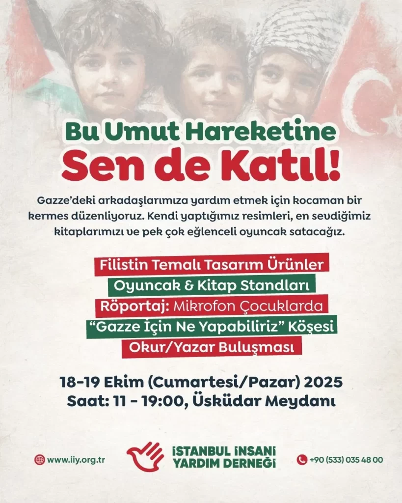 İstanbul İnsani Yardım Derneği, çocukların öncülüğünde düzenlenen anlamlı bir etkinliğe ev sahipliği yapıyor. 18–19 Ekim 2025 tarihleri arasında Üsküdar Meydanı’nda gerçekleştirilecek “Minik Aktivistler Sahada: Gazze İçin Çocuk Hareketi” adlı program, küçük yüreklerin büyük bir iyilik hikayesine imza atacağı özel bir buluşma olacak.