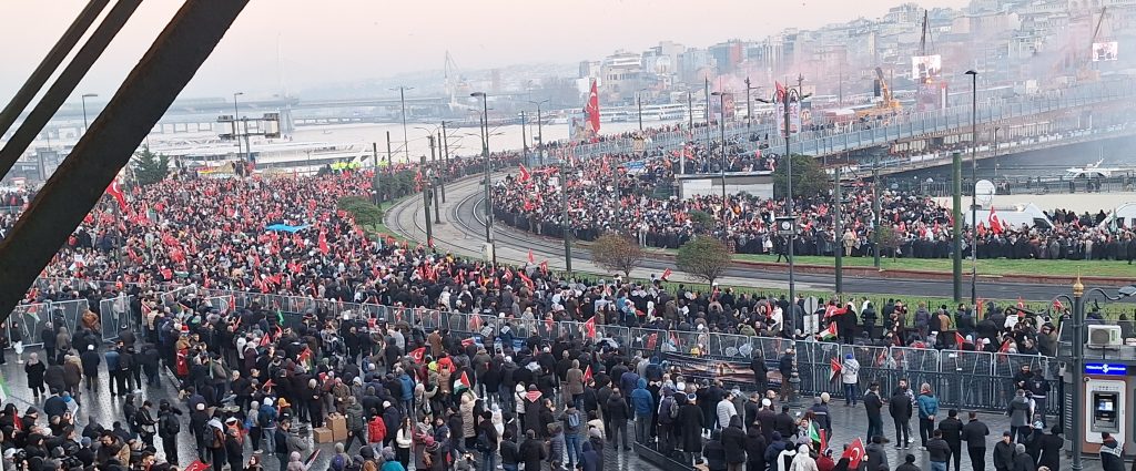 Milli İrade Platformu tarafından “Dünyayı uyandırıyoruz”, “Dün Ayasofya, bugün Emevi, yarın Aksa” ve “Bir güneş doğuyor” sloganlarıyla yeni yılın ilk sabahında Galata Köprüsü’nde düzenlenen Filistin’e destek yürüyüşüne binlerce vatandaş katıldı. Ayasofya-i Kebir Cami-i Şerifi’nde kılınan sabah namazının ardından vatandaşlar, ellerindeki Türk ve Filistin bayrakları ve boyunlarına bağladıkları kefiyelerle geniş güvenlik önleminin alındığı Galata Köprüsü’ne geldi. Yürüyüşe Gençlik ve Spor Bakanı Osman Aşkın Bak, Sanayi ve Teknoloji Bakanı Mehmet Fatih Kacır, Ticaret Bakanı Ömer Bolat, milletvekilleri, İstanbul Valisi Davut Gül, eski TBMM Başkanı Mustafa Şentop, TBMM Milli Savunma Komisyonu Başkanı Hulusi Akar, İlim Yayma Vakfı Mütevelli Heyeti Başkanı ve TÜGVA Yüksek İstişare Kurulu Üyesi Bilal Erdoğan, belediye başkanları, TÜGVA Genel Başkanı İbrahim Beşinci gibi birçok isim de katıldı.