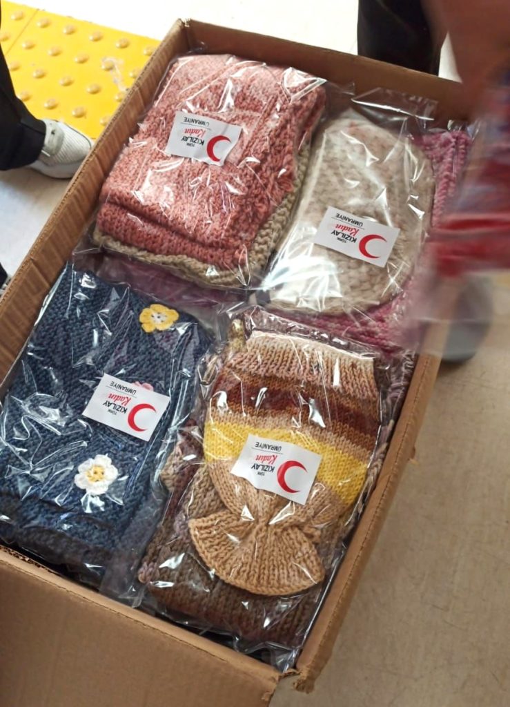 Ümraniye Kızılay Şubesi Kadın Kolları gönüllüleri “Çocuklarımız gülerse yürekler mutlu olur” diyerek el emeği, atkı, bere örgüleri deprem bölgesi Adıyaman’a gönderdiler.