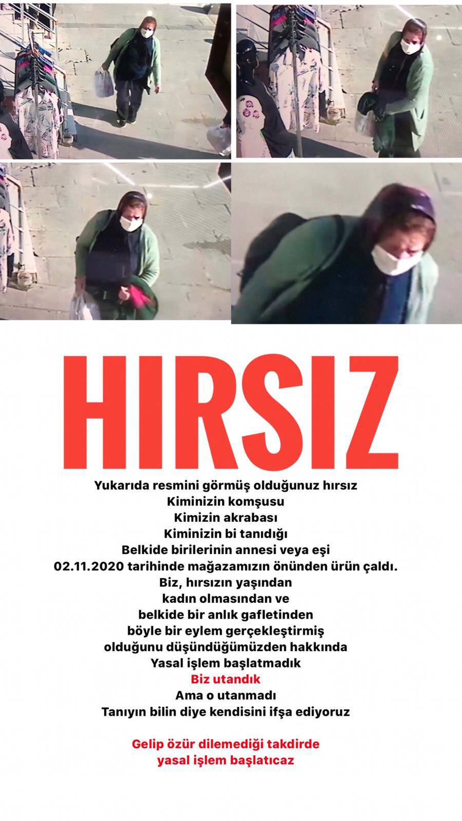 Olay, Arnavutköy Merkez Mahallesi Ayşıl Sokak üzerinde bulunan bir giyim mağazasında meydana geldi. Edinilen bilgilere göre, dün mağazaya gelen bir kişi, kapıda bulunan kıyafetleri alarak kaçtı. Kapıdaki kıyafetlerin olmadığını fark eden dükkan sahibi güvenlik kamerasını inceleyerek hırsızın fotoğrafından afiş yaptı. Dükkanından sık sık hırsızlık yapılan Alpay Fatih Türcan, kadının fotoğrafının bulunduğu afişe “Yukarıda resmini görmüş olduğunu hırsız kiminizin komşusu, kiminizin akrabası, kiminizin bir tanıdığı, belki de birilerinin annesi veya eşi 02.11.2020 tarihinde mağazamızın önünden ürün çaldı. Biz, hırsızın yaşından kadın olmasından ve belki de bir anlık gafletinden böyle bir eylem gerçekleştirmiş olduğunu düşündüğümüzden hakkında yasal bir işlem başlatmadık. Biz utandık ama o utanmadı. Gelip özür dilemediği takdirde yasal işlem başlatacağız” yazsısını yazdı.